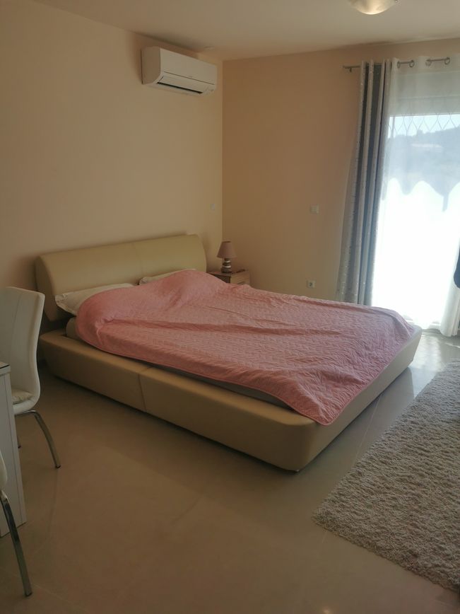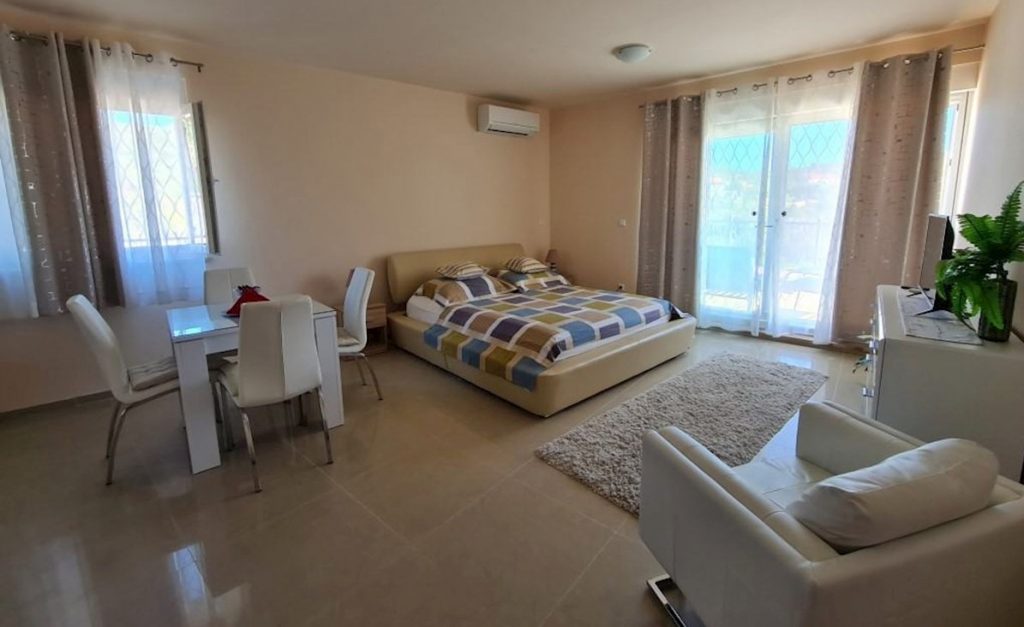 Die Ein-Zimmer Ferienwohnung im Erdgeschoss links bietet mit ihren ca. 55 m² viel Raum und hat eine eigene Sonnenterasse mit einem fest verbauten großen dalmatinischen Grill und einem Whirlpool. Die Sonnenterasse ist mit einer Markise beschattet.