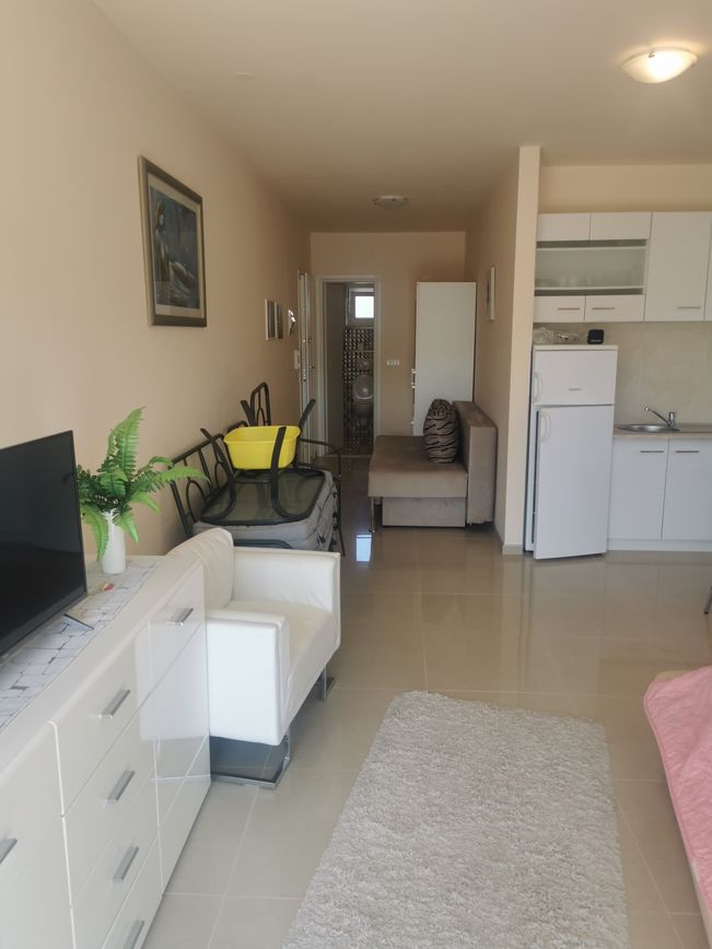 Das sehr geräumige Ein-Zimmerappartement ist mit einem Doppelbett, einer Klappcoch und einer vollwertigen Küche mit Essecke eingerichtet.