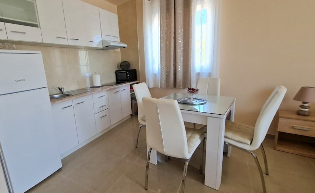 Die Ein-Zimmer Ferienwohnung im Erdgeschoss links bietet mit ihren ca. 55 m² viel Raum und hat eine eigene Sonnenterasse mit einem fest verbauten großen dalmatinischen Grill und einem Whirlpool, evtl. auch schon einen Infinitipool auf dem Dach. Die Sonnenterasse ist mit einer Markise beschattet.