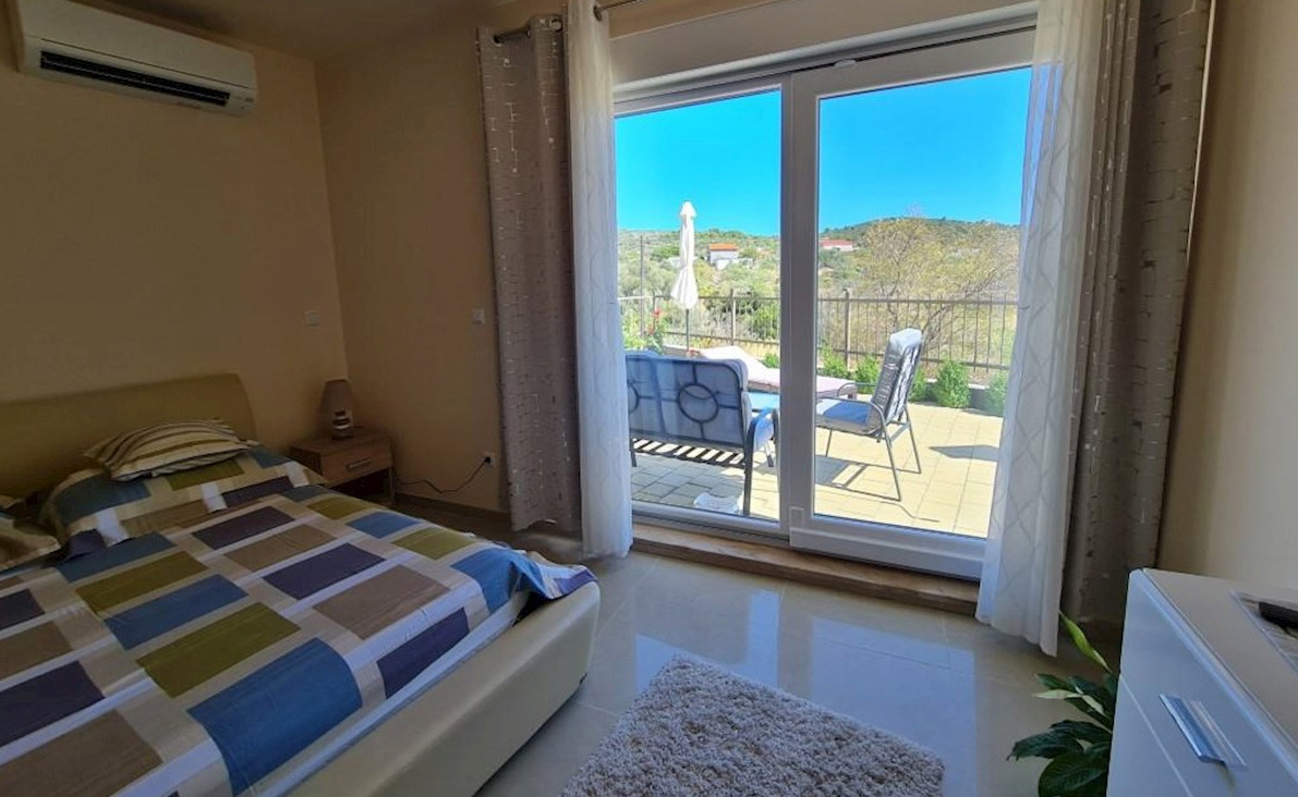 Die Ein-Zimmer Ferienwohnung im Erdgeschoss links bietet mit ihren ca. 55 m² viel Raum und hat eine eigene Sonnenterasse mit einem fest verbauten großen dalmatinischen Grill und einem Whirlpool. Die Sonnenterasse ist mit einer Markise beschattet.