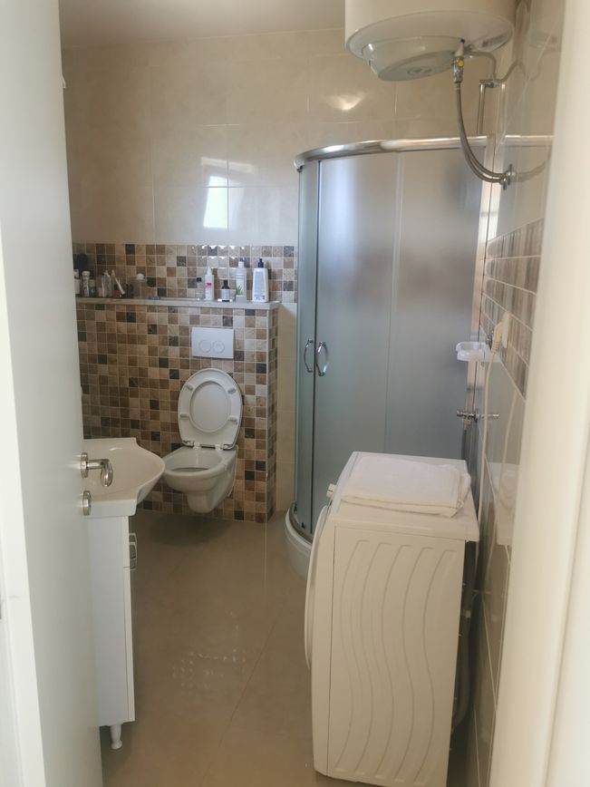 - Das Bad verfügt über eine Dusche und eine Waschmaschine