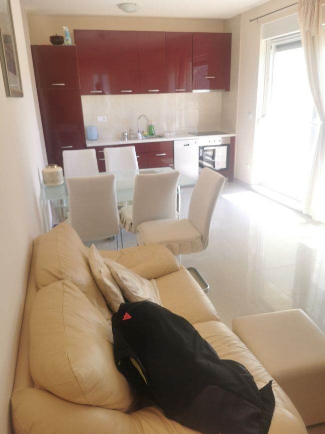 Der Wohnraum ist mit einer Klappcouch, einem Essplatz und einer voll ausgestatteten Einbauküche incl. Spülmaschine ausgestattet.