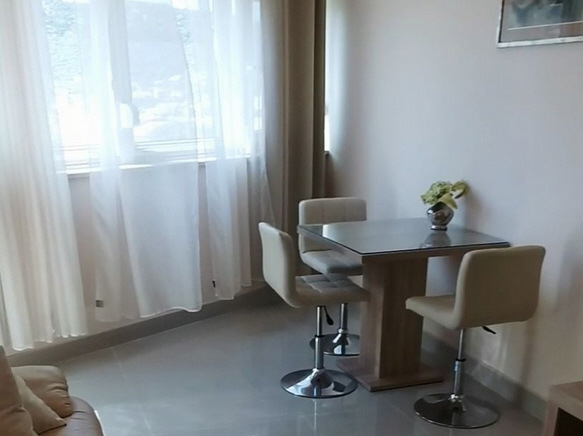 Der Wohnraum ist mit einer Klappcouch und einer voll ausgestatteten Einbauküche incl. Spülmaschine und einem Essplatz ausgestattet.