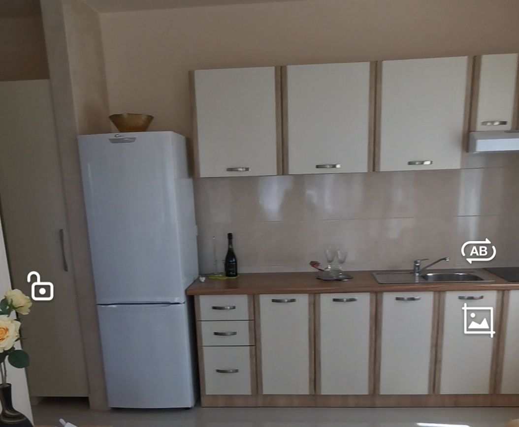 Der Wohnraum ist mit einer Klappcouch und einer voll ausgestatteten Einbauküche incl. Spülmaschine und einem Essplatz ausgestattet.
